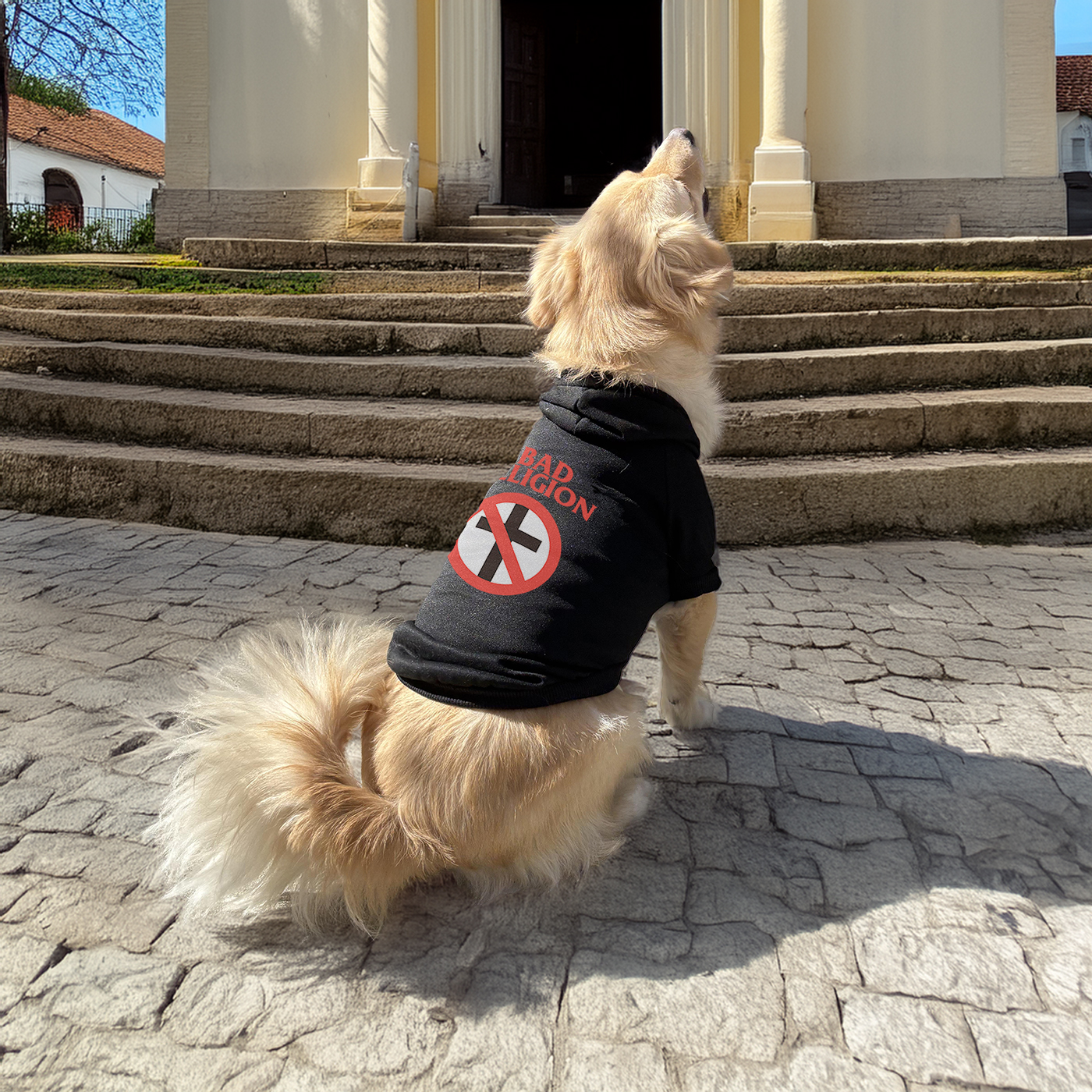 Your dog can’t quote Greg Graffin, but they can definitely wear this iconic symbol. This black dog sweatshirt showcases Bad Religion’s Crossbuster logo—the mark of a band that blends melodic punk, political insight, and academic-level critique. A perfect fit for music fans everywhere. TJ is 25 lbs and wearing an 2XL. In the size chart photo, Spanky is 35 lbs and wears a 3XL.