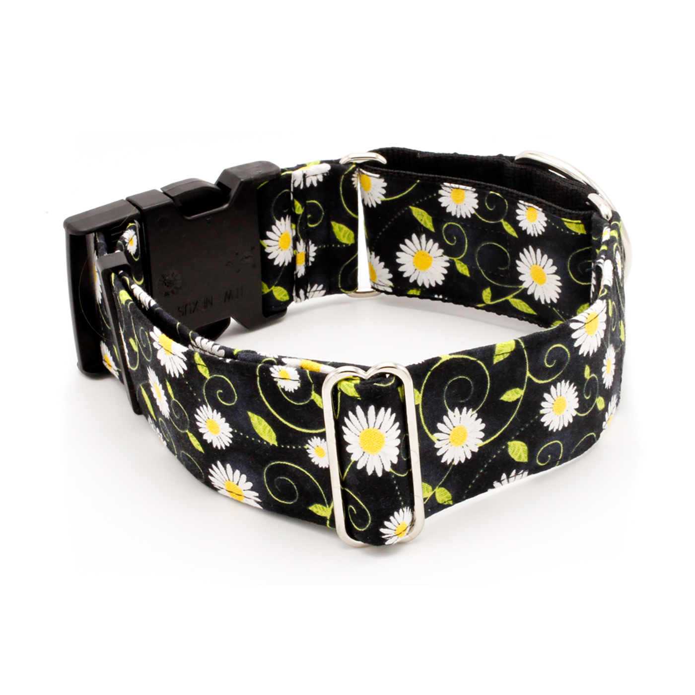 Brighten your dog’s style with this bold floral collar. Featuring crisp white and sunny yellow daisies on a black background, it makes a striking statement on every walk and in every photo. Perfect for dogs who love to stand out with a touch of personality and charm.