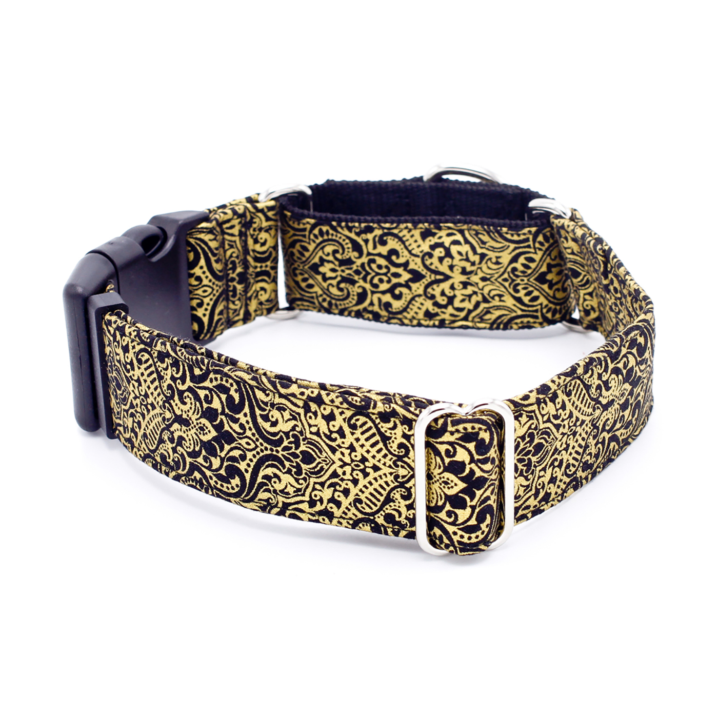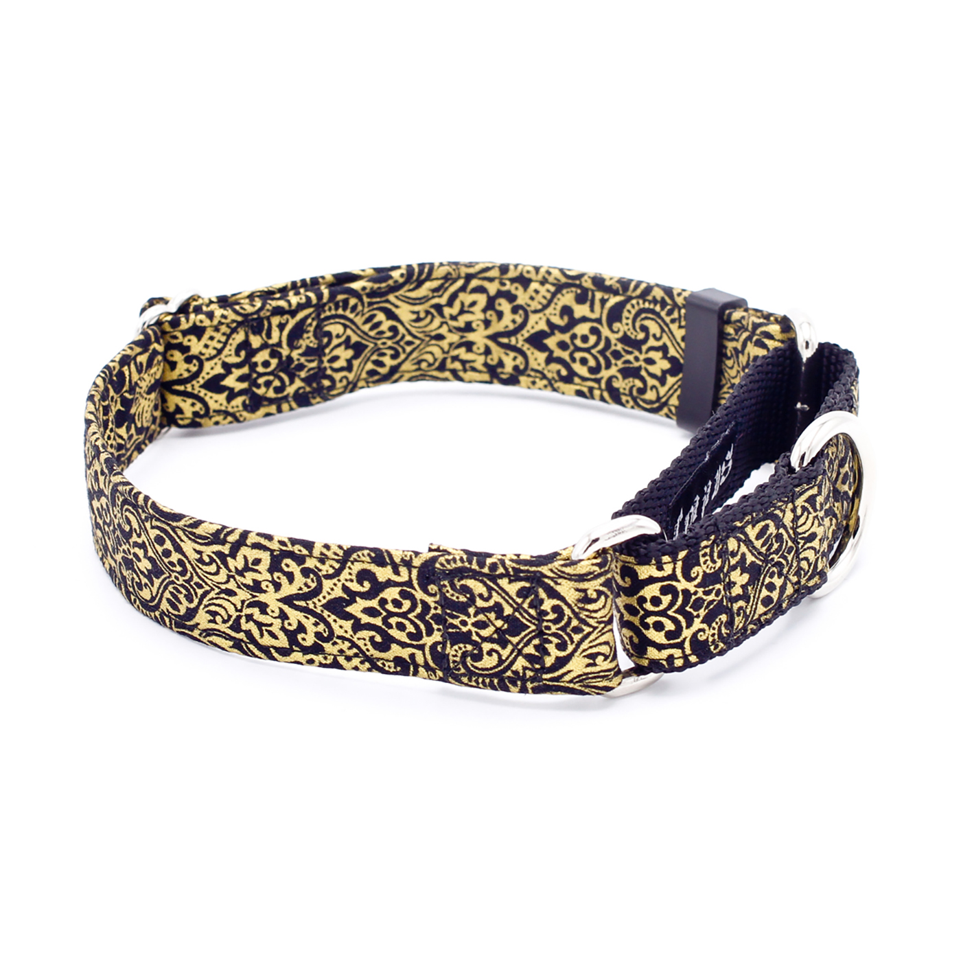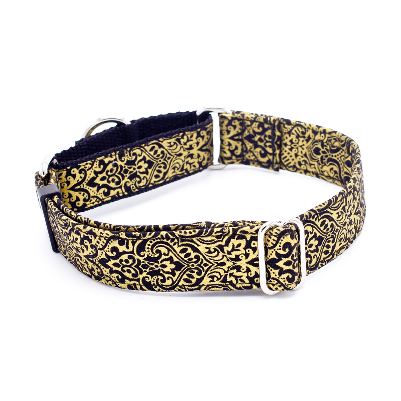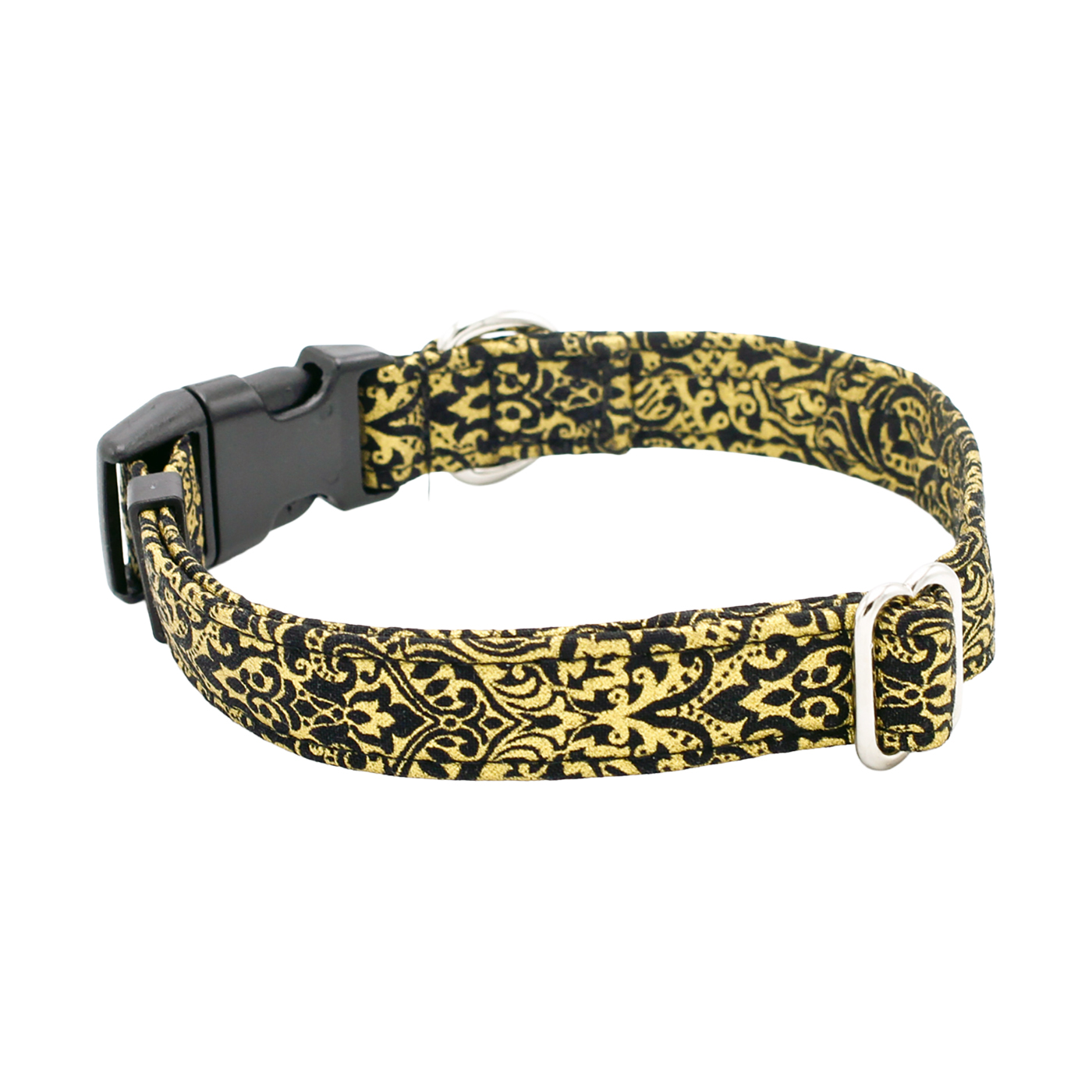 Gold damask flourishes shimmer against a sleek black background, giving your pup a look of timeless elegance. This sophisticated dog collar adds a touch of luxury and style to every walk, making your furry friend the center of attention wherever they go.