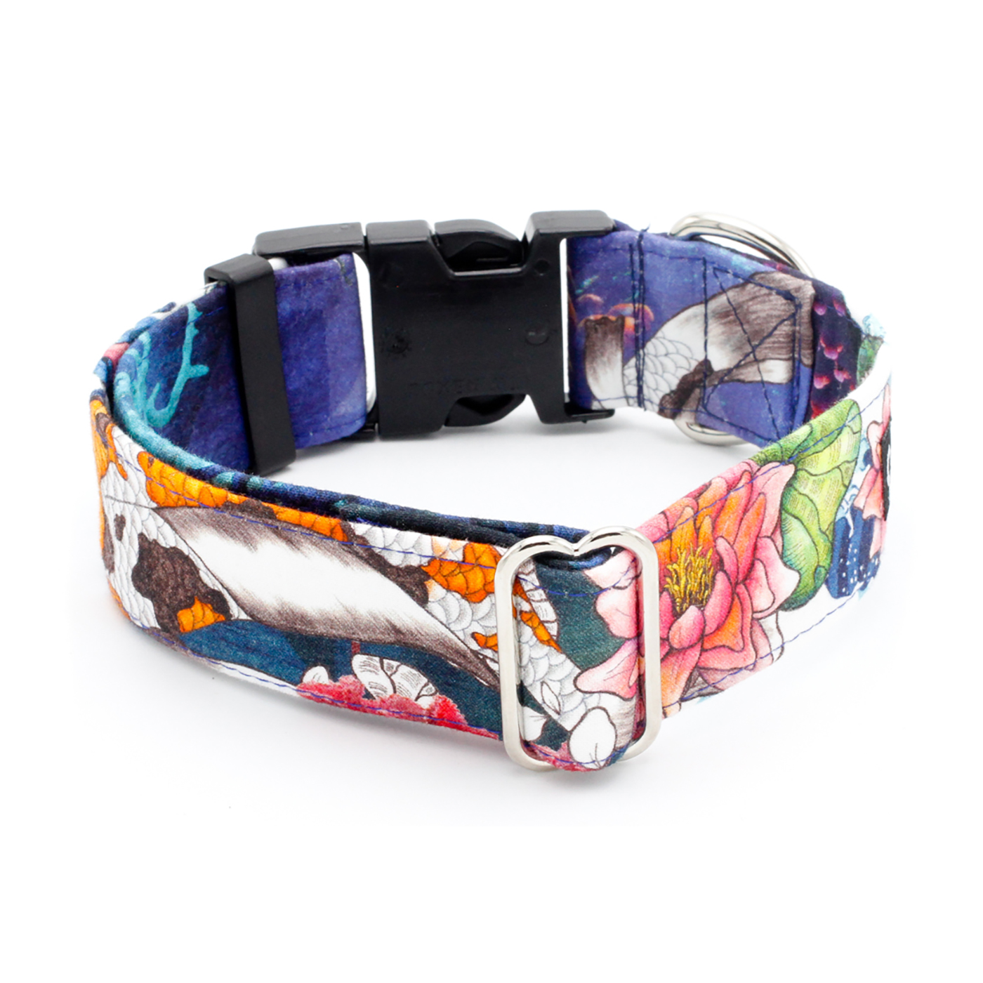 This stunning dog collar features realistic, large koi fish swimming gracefully through a painted backdrop of ocean waves and delicate flowers. Inspired by traditional Japanese art, the design blends natural beauty with flowing movement, creating a unique and eye-catching accessory for your pup. Elegant, artistic, and full of symbolic meaning, this koi fish collar is perfect for dogs who deserve to stand out in style.