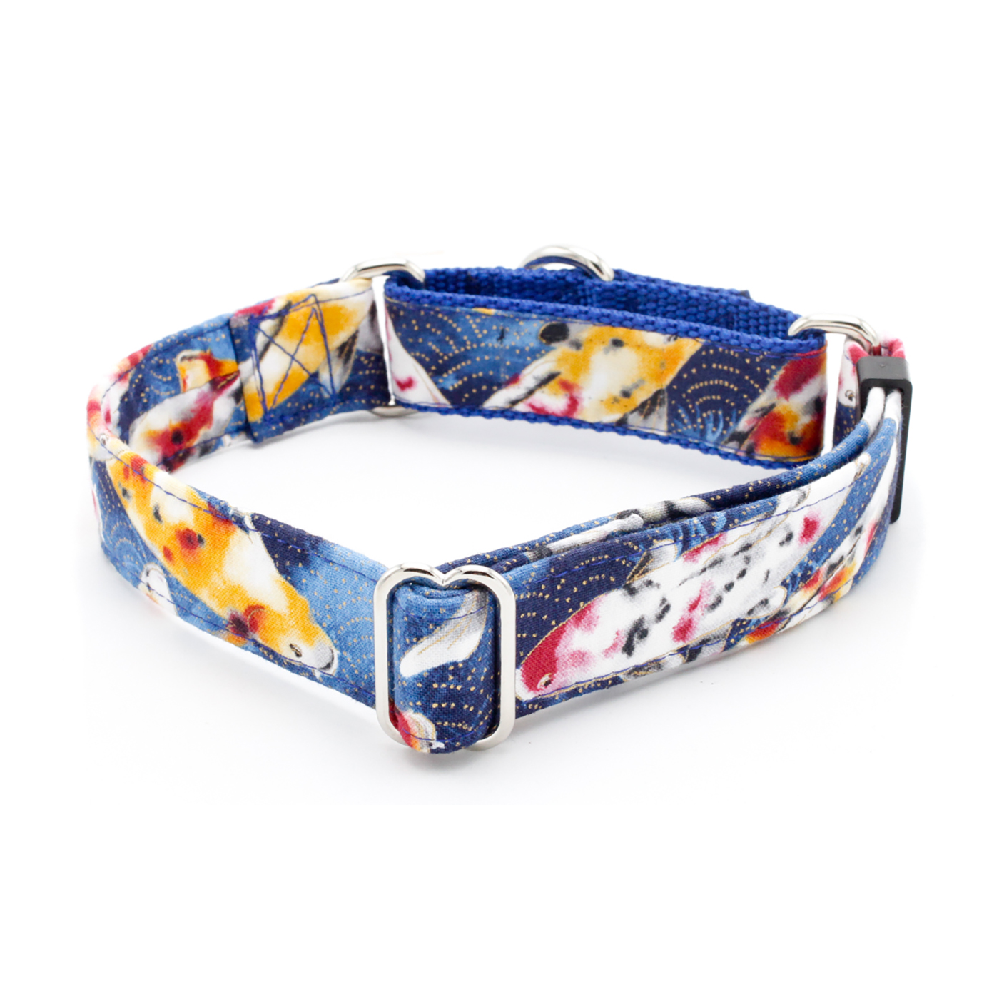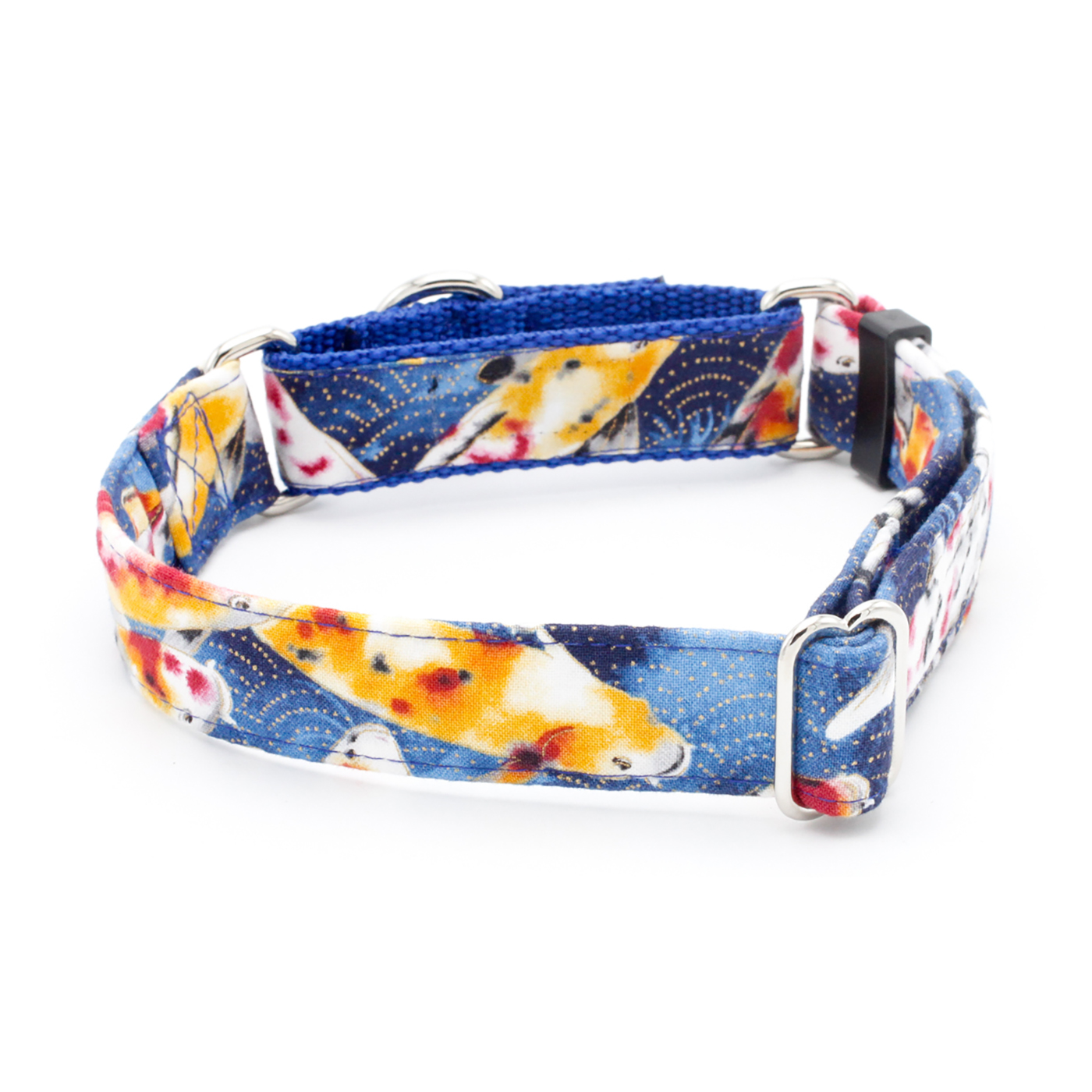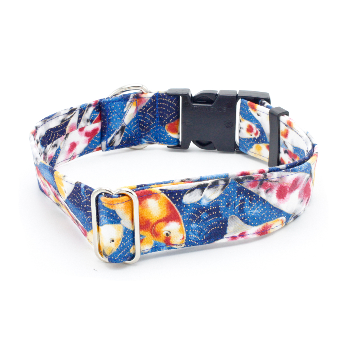 Bring a touch of serenity to your pup’s style with our Koi Fish Dog Collar! Featuring graceful schools of koi swimming across a deep blue background with shimmering gold accents, this collar captures the beauty and calm of a koi pond. Perfect for dog lovers who appreciate nature-inspired designs, this unique dog collar adds a splash of elegance and charm to every walk.