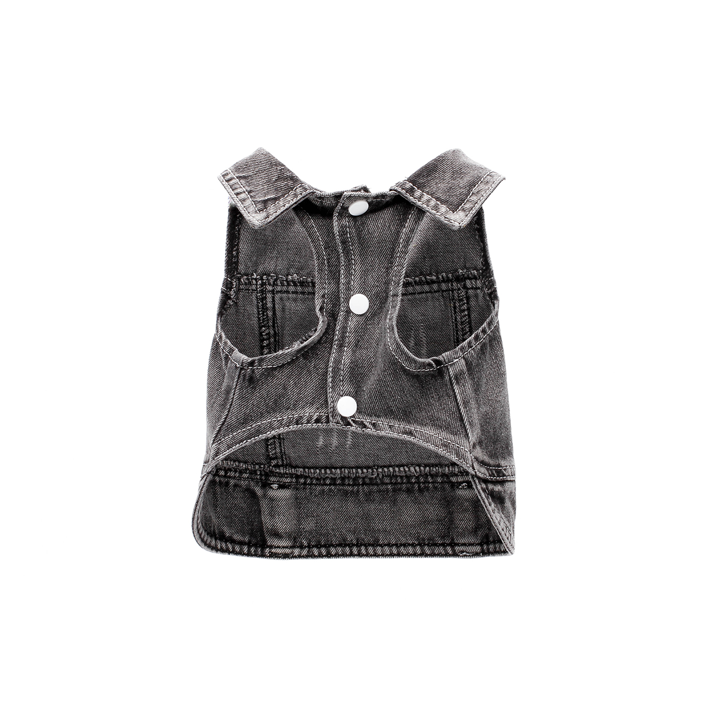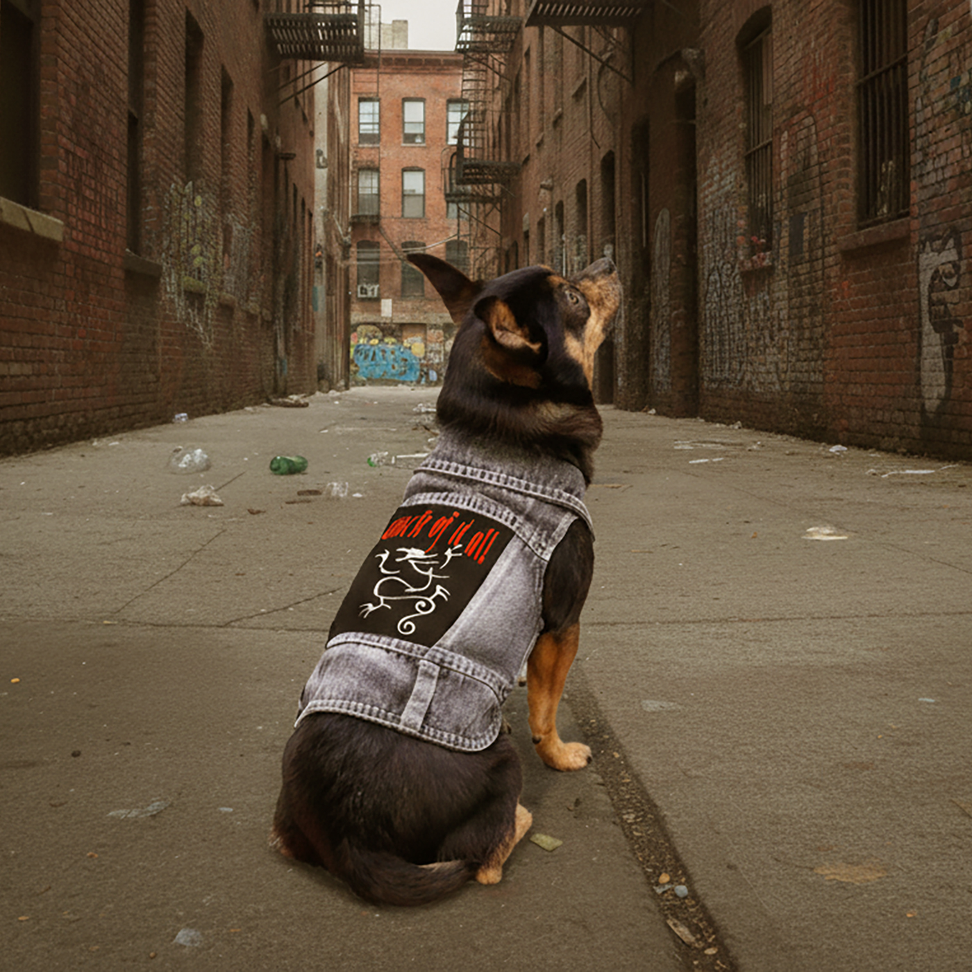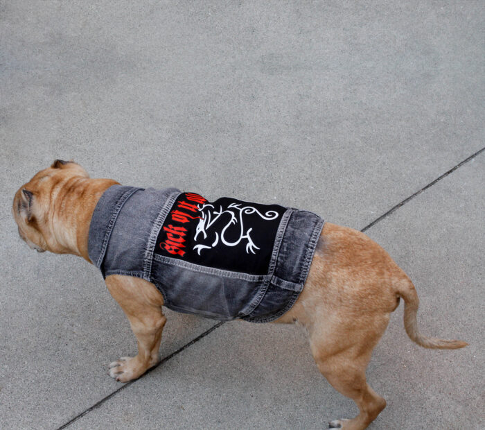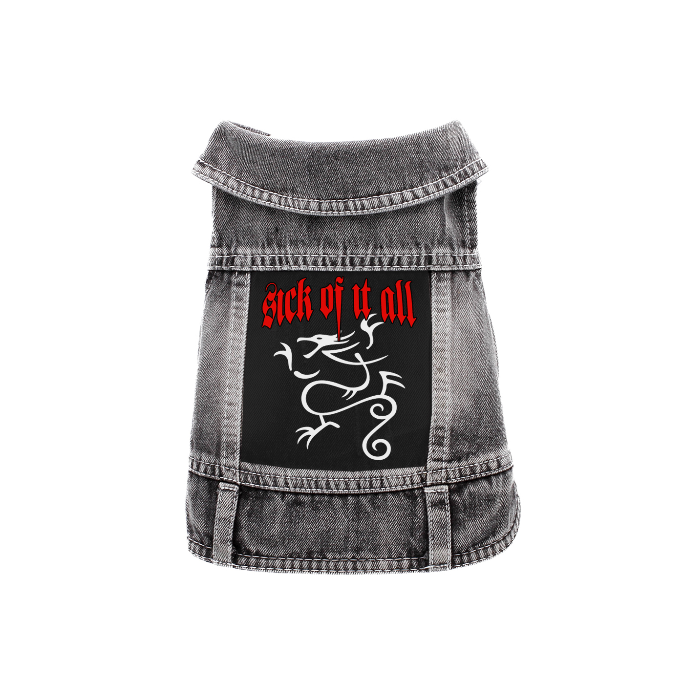 Turn your dog into the ultimate NYHC mascot. This black denim vest features the Sick of It All logo and dragon stitched on the back — a must-have for fans who want to share their hardcore roots with their most loyal roadie. Spanky the blonde staffie is 33 lbs and is wearing the largest available size, XXL. Chili the black chihuahua is 9.5 lbs and wearing a M.